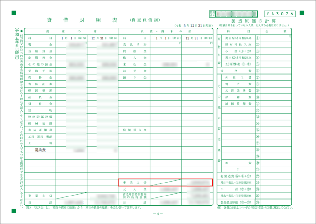 赤枠部分が事業主借で、返済を想定していないため借方に斜め線が入っている