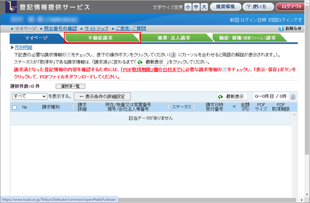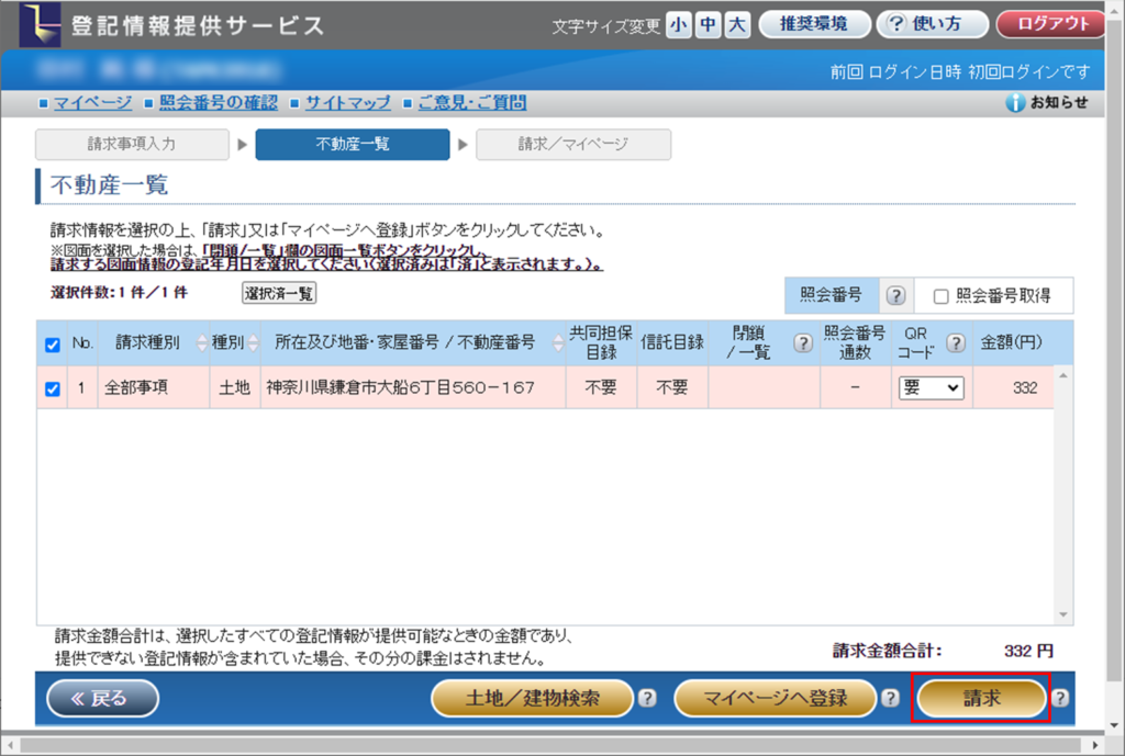 不動産請求を押下。