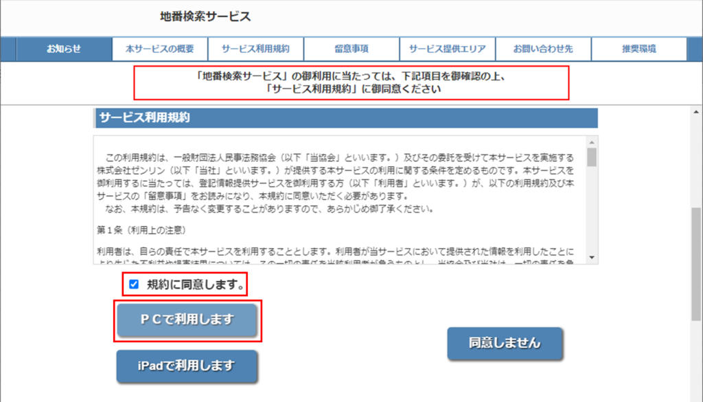 規約に同意します。にチェックし、今回はPCで実施しているためPCで利用しますを押下。
