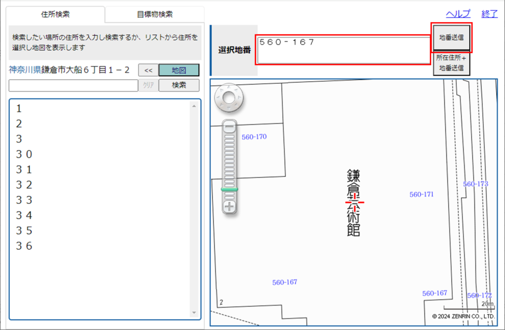 青字の地番をクリックすることで選択地番に値が入るため、地番送信を押下。