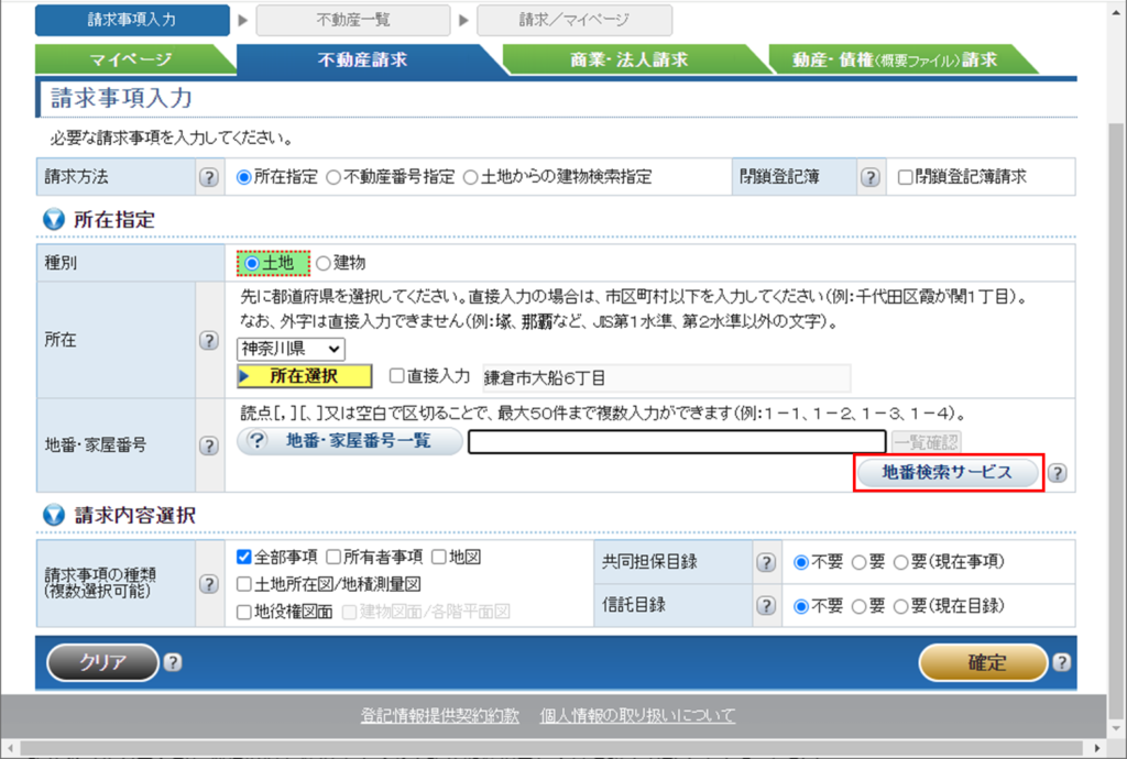 例に従って市区町村以下まで入力したら地番検索サービスを押下。
