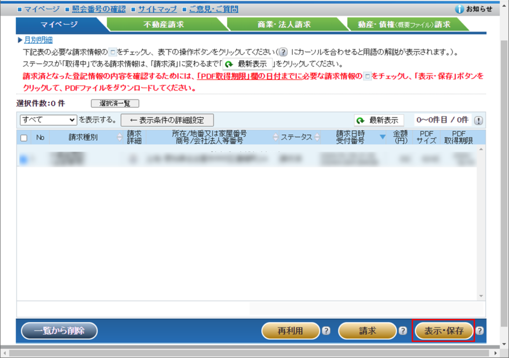 請求した登記情報がマイページに現れるようになるため、表示・保存を押下して登記情報のpdfをダウンロード。ただし請求してすぐには表示できないことがあるため、最新表示を何度か押下して確認する。